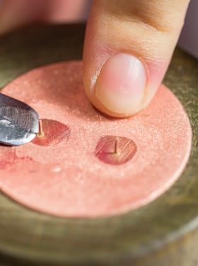 Like with all grand feu enamel dials, a the copper disc is coated on both sides with an inflammable liquid before the enameler him or herself applies a thin later of enmal powder. Then, the dial goes into a kiln at 830° C, thus the term "grand feu" or "great heat".