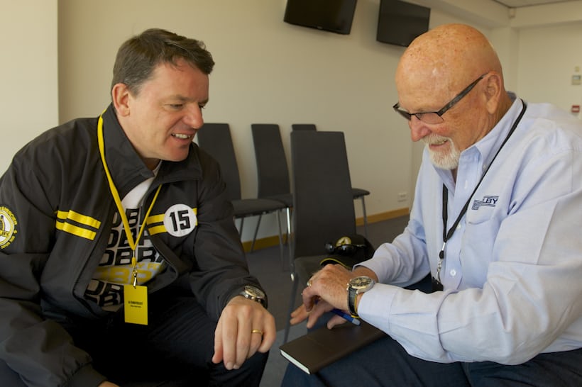 Near the end of the day, Alain Zimmermann gathered this diverse group on the terrace above the track and announced the release of four extremely limited edition watches. The Capeland Cobra “Legendary Drivers” chronographs are each dedicated to a famous Shelby race team driver from the 1960s – Ken Miles, David MacDonald, Dan Gurney, and Allen Grant, the latter of whom was present at the track. Each of the four watches is different, taking cues from the driver to whom it is dedicated, with his race number on the dial, different color schemes and straps. Only 15 of each will be made, to be released in October, and priced at $4,850.
