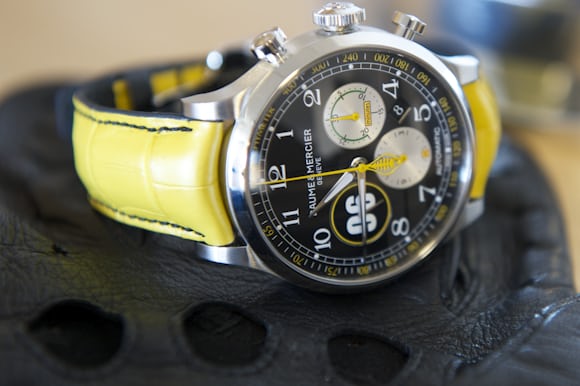 Getting car-inspired watches right is a tricky proposition and history is littered with near misses and outright tasteless examples. But to Peraldi’s credit, the Cobra Capelands are downright subtle in my opinion. Baume leans on nostalgia in many of its watches and the Capeland is no exception, with its pump pushers, stylized Arabic numerals and domed crystal. The Cobra editions don’t have glaring logos on the dial or tire tread straps; rather, the subtle matte racing stripes on the dial are hardly noticeable and the use of color – black, yellow, and a thin arc of green, separate the latest Cobra edition from the standard Capelands.