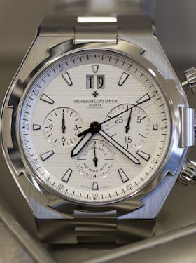 Here, on the wrist of Marshall Pierce Timepiece Specialist Saul Hernandez, is the 42 mm Vacheron Constantin Overseas Chronograph in stainless steel.