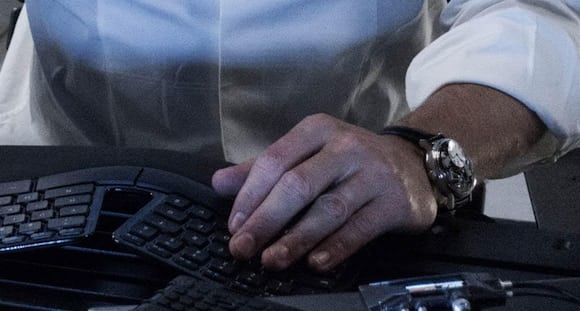 This one is tougher – Breguet tipped us off about the La Tradition, and we sat around for quite a while trying to figure out what Alfred's wearing. Consensus was that it was probably a Breitling, but we couldn't dig up anything that seemed like an exact match – the general configuration of the crown guards, shape and style of the watch, and so on seemed right though. So we asked Breitling, and as it turns out we were right – it's a Breitling for Bentley 6.75 Midnight Carbon Limited Edition.