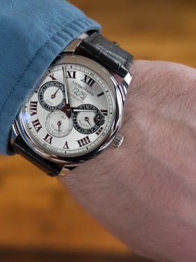 On the wrist, the Perpetual Twin wears a bit large (the case is 43 mm in diameter, and 11.47 mm thick) but I didn't find the size excessive, probably thanks to the fact that the width/thickness aspect ratio makes the watch wear a bit on the thin side. So what don't you get from this watch? Well, if you want a design that's as classic in features and execution as the perpetual calendar itself, the slightly idiosyncratic design of the Perpetual Twin will probably not ultimately appeal to you enough to make you seriously consider owning one. However, I think this watch makes a very interesting offering. It's qualitatively excellent overall, and in terms of haute horlogerie complications offerings, it's a very attractive value at $22,890.