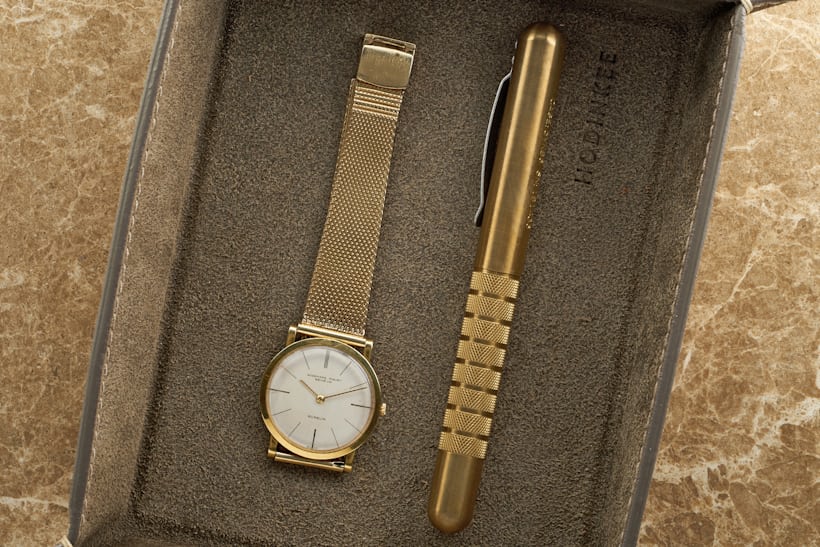 Audemars Piguet is most often associated with hefty Royal Oaks, but what a lot of people might not know is that they used to produce one of the world's thinnest movements – the caliber 2003. Here you have an excellent dress watch retailed and signed by famed luxury Swiss retailer Gübelin that also houses the 1.64 mm thick movement. Not only does this watch look great – it also comes with its original box, invoice from Gübelin, the check that bought it (for $486), and extra mainspring. For more on this watch click here.