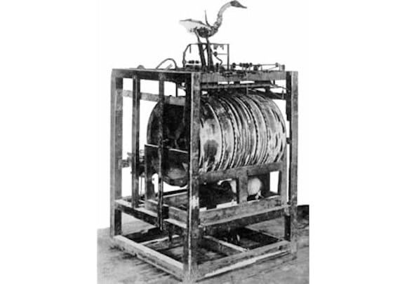 The Digesting Duck did something no one had ever seen before, or at least, appeared to: offered food pellets (grains of oats, for instance) it would dip its head, consume them, and, a short while later, produce excrement. It is known to us now only from contemporary illustrations (it was shown to the French Academy of Sciences, and the public, in 1738 and created an immediate sensation) and from photographs. The final fate of the duck is unknown, as is the fate of the other two automata. Supposedly, the duck was destroyed by fire in a Krakow museum, in 1879, but in the mid-1930s, according to Byrd, "a conservator (at the Musée des Arts et Métiers in Paris) turned up several photographs of a skeletal bird with wings and springs, sitting on a complex pedestal of gears . . . the photographs are relatively modern and the are marked 'images of Vaucanson's duck, received from Dresden,' but nobody seems to know when they were taken, or by whom."