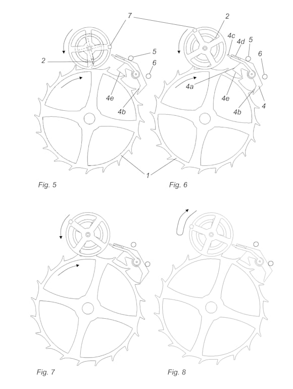 At Fig. 5, the lever is pushed home against the locking pin. At Fig. 6, another escape wheel tooth starts to slide against the detent rocker at 4b and this moves the lever back in the other direction, so that surface 4a locks the escape wheel.