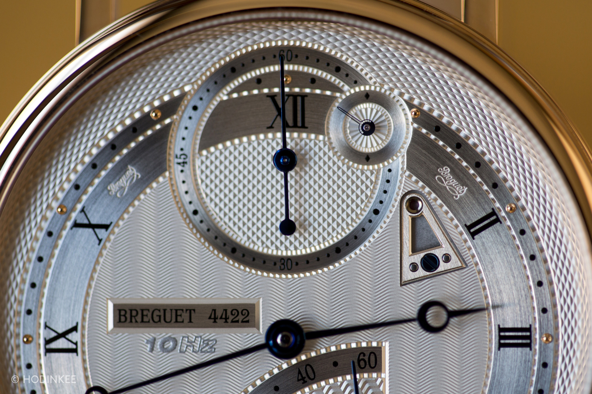 The dial is ornate, as we've come to expect from Breguet. To me, it might even be too ornate. Six different hand-turned guilloché patterns on a watch this size is a lot. Add that to the silvered ring, two not-so-secret signatures, and a few superfluous labels (I'm looking at you "10 Hz") and you have a really busy dial. It's an impressive dial, certainly, but a busy one no less.