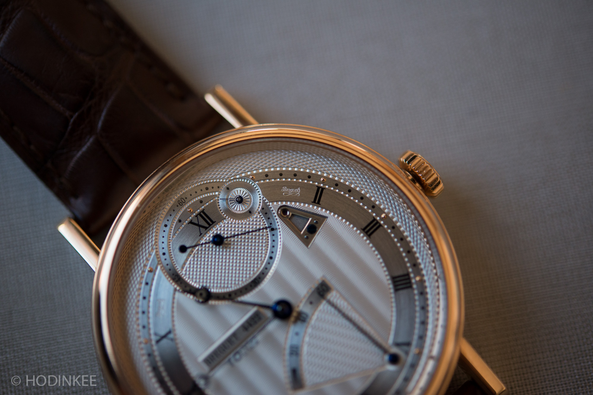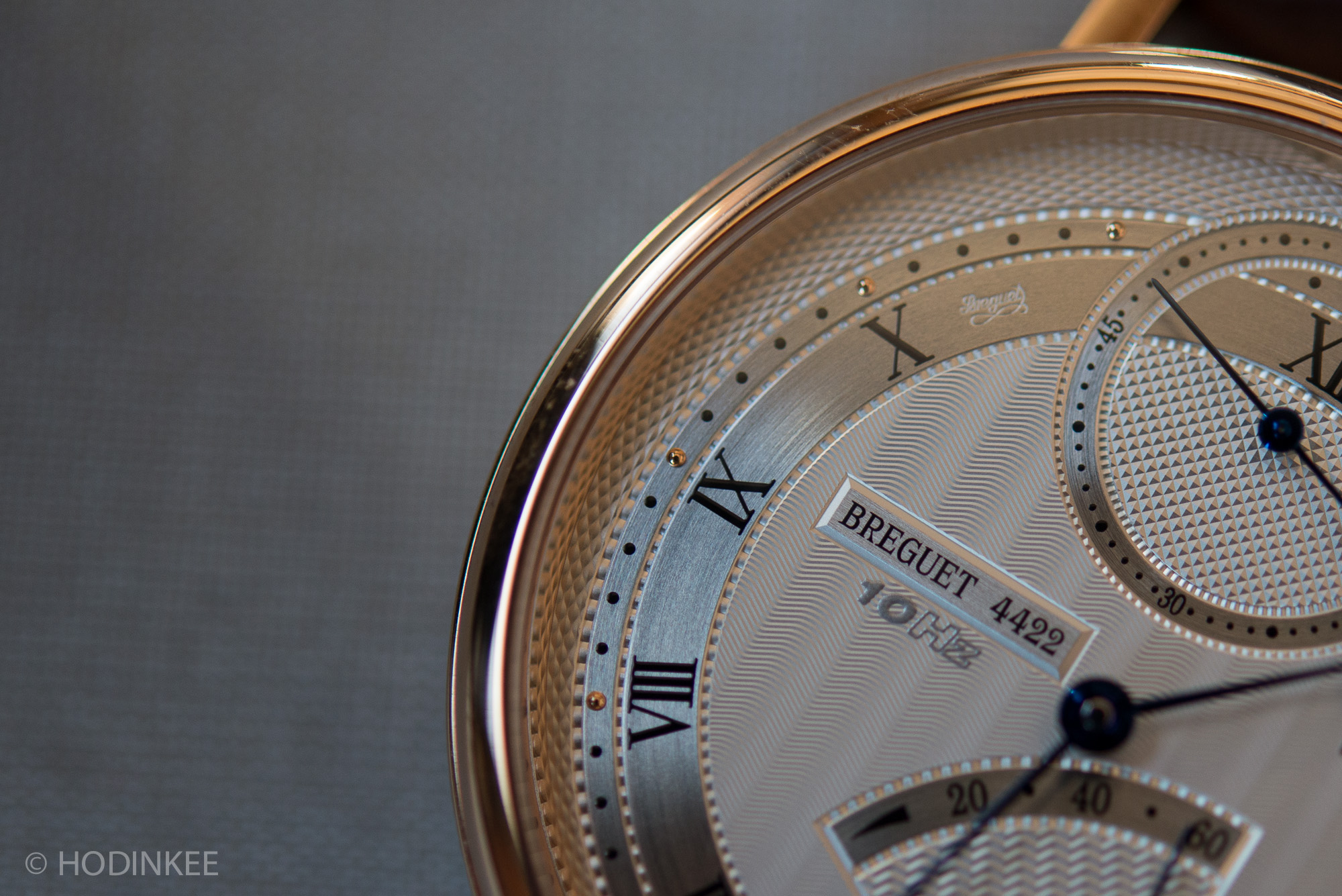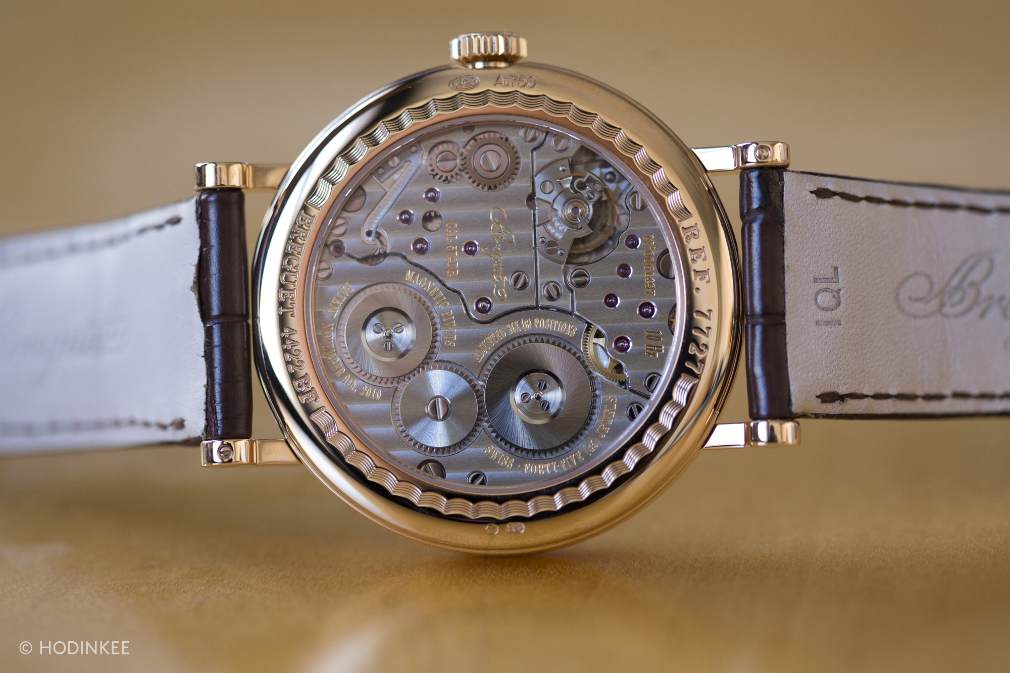 So you have all these traditional types of dial work and then you have a few things that seem a little callous. The 10 Hz label not only seems unnecessary, but is also a little jarring in that hyper-modern font set just under the Breguet signature. Now I understand the need to label technically interesting watches – the average consumer doesn't read HODINKEE (yet!) and has no idea that this watch offers some cool things on the movement side. It's the same reason JLC's new Geophysic reads "Tru-Beat" on the dial – people need to know there is something special about the watch from three feet away. But the 7727 seems different – it's a watch that takes a lot of explanation to understand, and it's one that to me is clearly geared towards gear heads and connoisseurs.